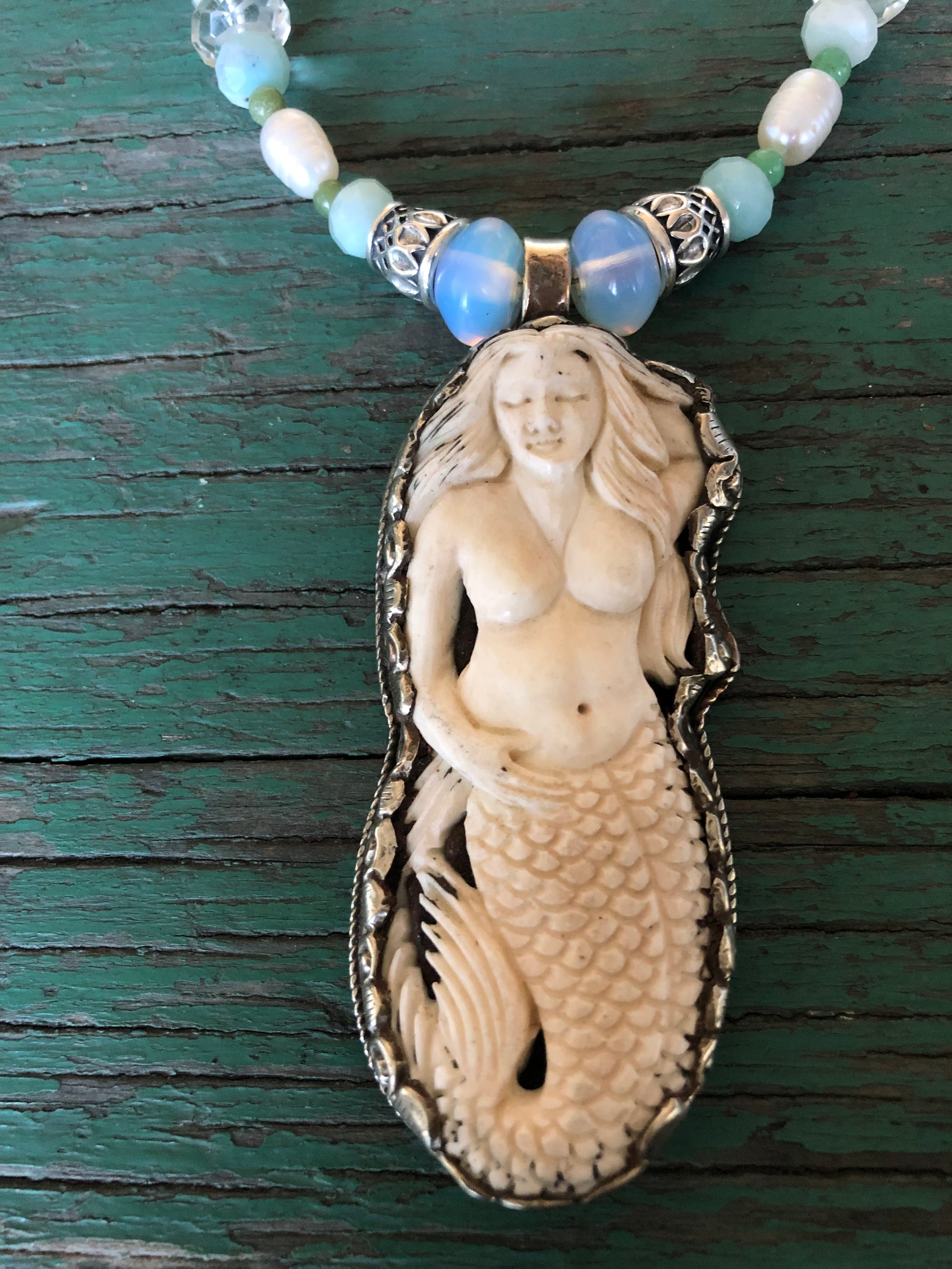 Carved mermaid pendant with aquamarine, pearl, moonstone, larimore, kyanite and sterling silver.