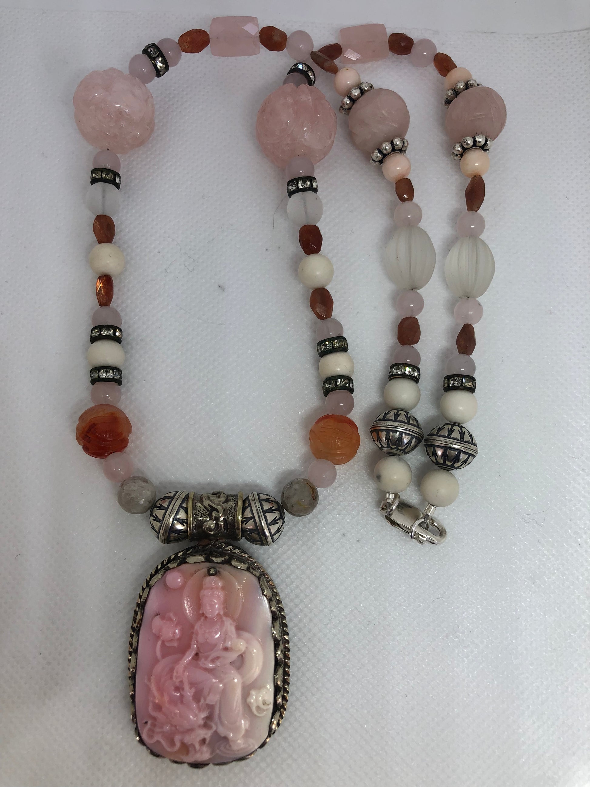 Antique beads carved from rose quartz and carnelian with sterling silver and antique spacers.